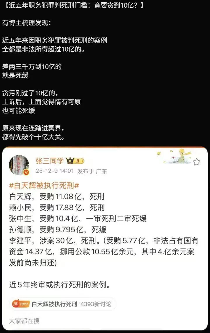 笔者最近看到一个截图,发现只要官员贪污受贿不超10亿,一般死不了。这也颠覆了笔者的价值观。难怪有人说,现在没个10亿,阎王爷都不收。