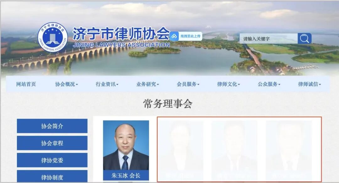 笔者按图索骥,检索“济宁市律师协会”官网,在“常务理事会”一栏,发现朱某某照片及会长称谓赫然在列;笔者继续检索“山东律师网”官网,在“常务理事会”一栏,也发现朱某某确为山东省律协的副会长、理事。